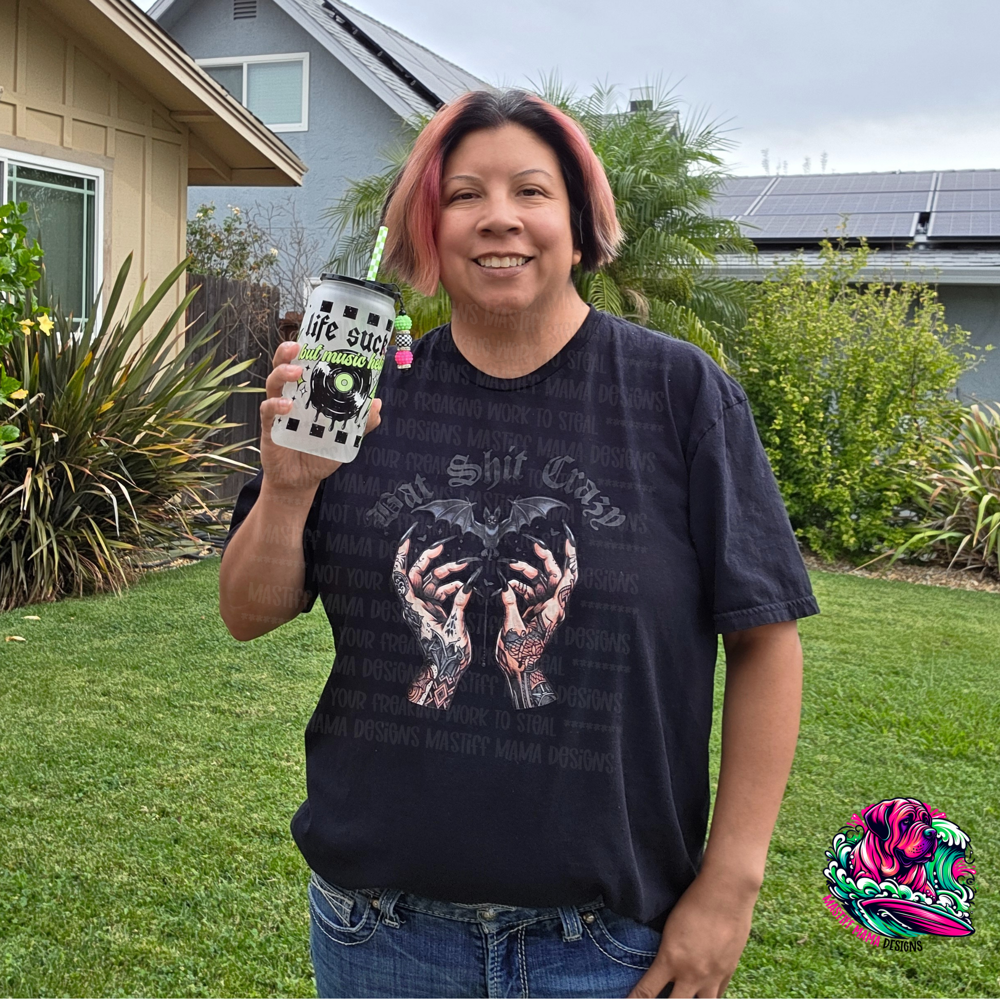 This Bat Shit Crazy unisex short sleeve shirt brings edgy attitude wrapped in soft, 100% cotton comfort. Perfect for alt girlie vibes, it’s a bold way to express your one-of-a-kind style with every wear. The cup that I'm holding can be found under drinkware collection or by searching life sucks but music helps.