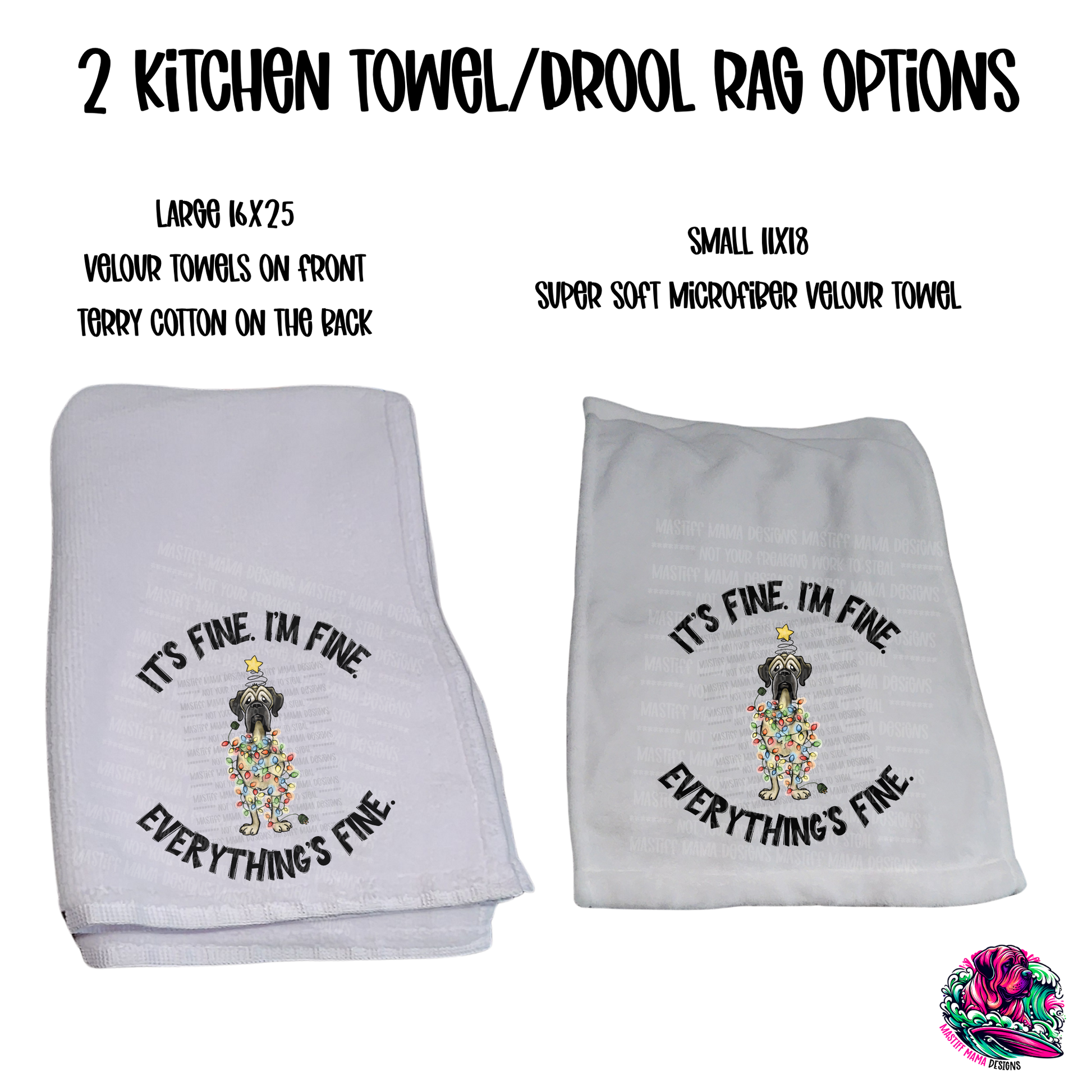 Meet your new kitchen essential with a side of holiday humor! These Flat Frankie exclusive kitchen towels feature the hilariously relatable "It's Fine I'm Fine Everything's Fine" design wrapped around tangled Christmas lights—because let's face it, the holidays can be chaotic. Perfect for wiping up messes or catching drool from your mastiff, these towels are as practical as they are funny. Select your preferred size and choose between a single towel or a three-pack bundle. This exclusive design is only available at Mastiff Mama Designs, making it the perfect gift for dog lovers who don't take themselves too seriously!