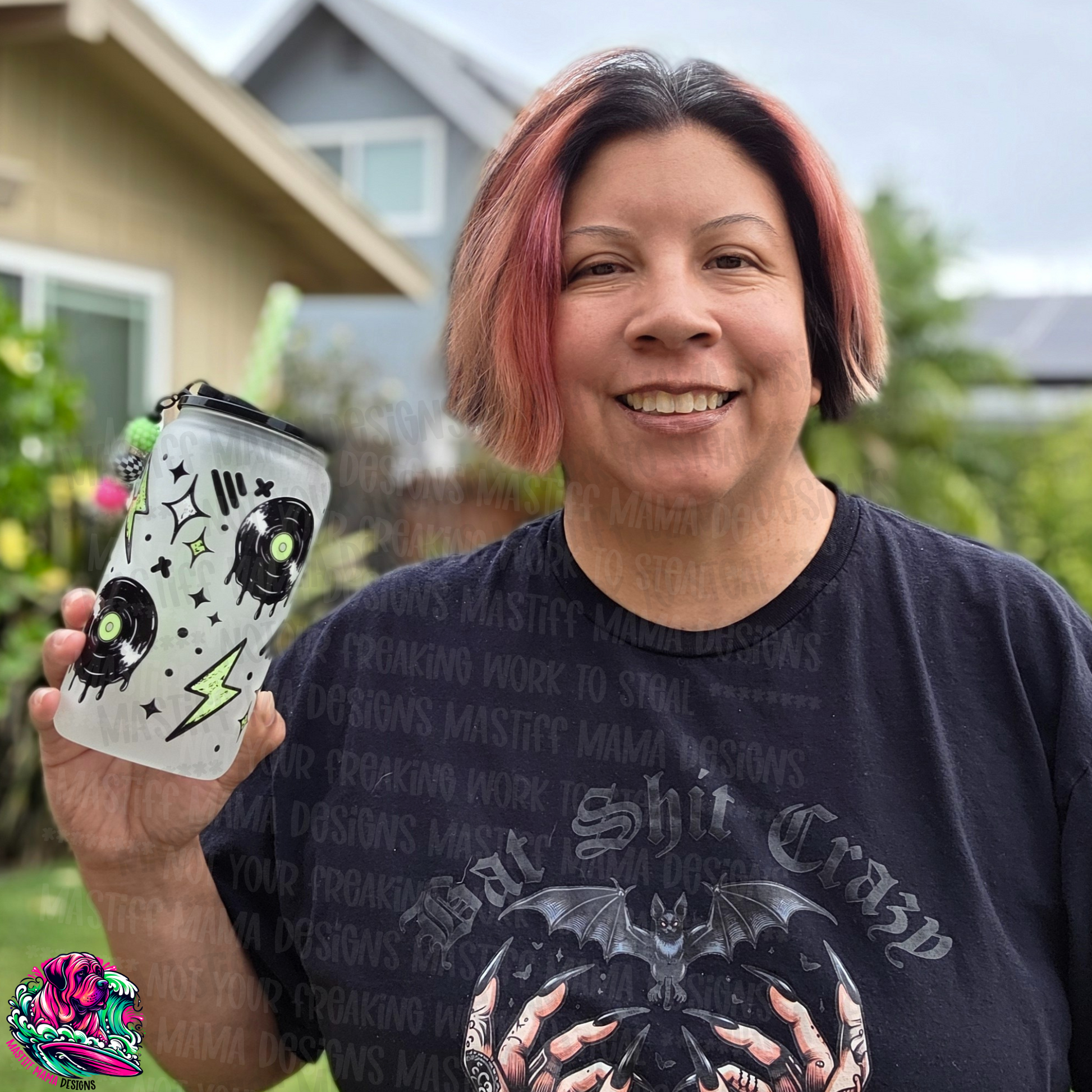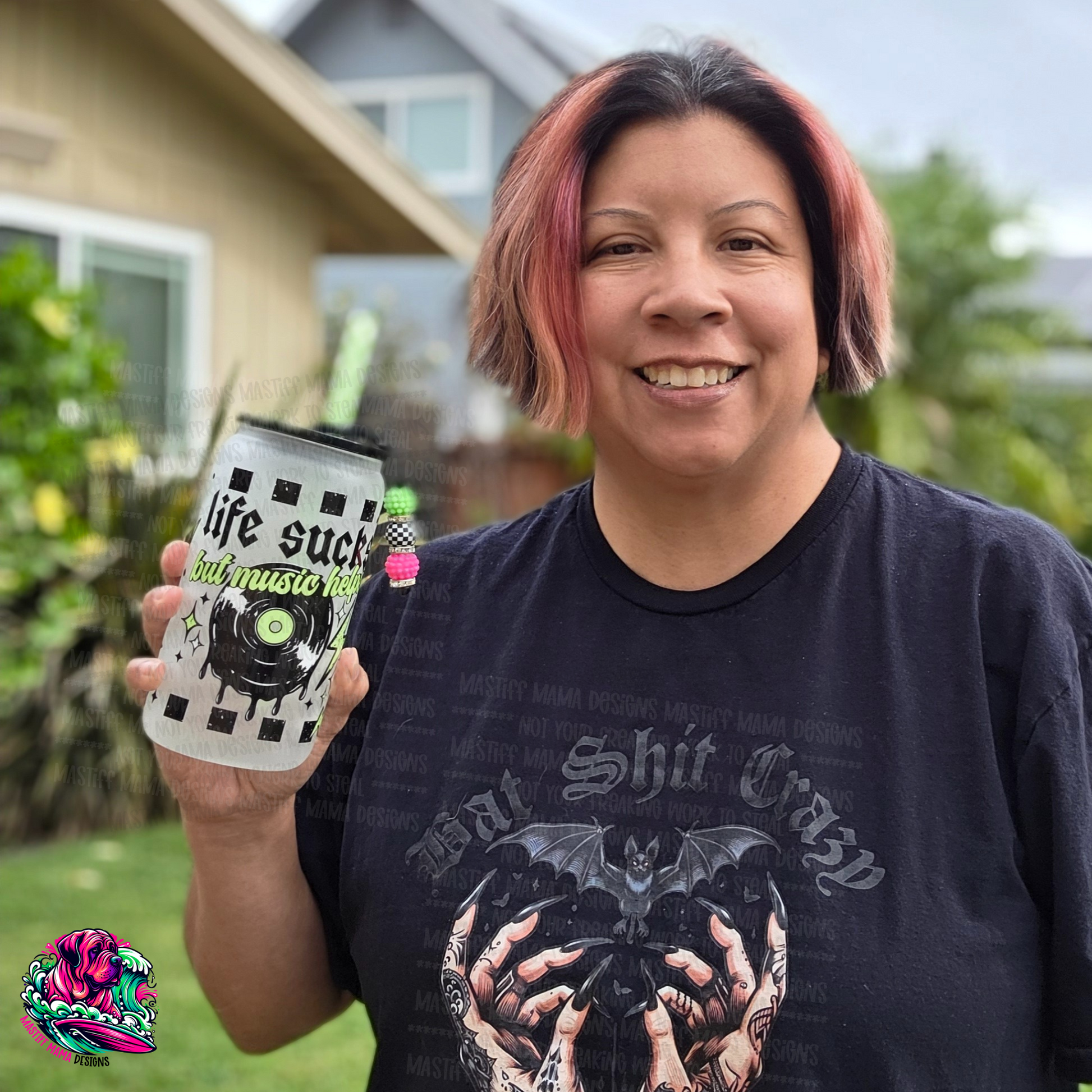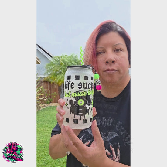 Life Sucks But Music Helps UVDTF wrap on Frosted 16 oz Glass Can - Use Drop Down Menu to select your option