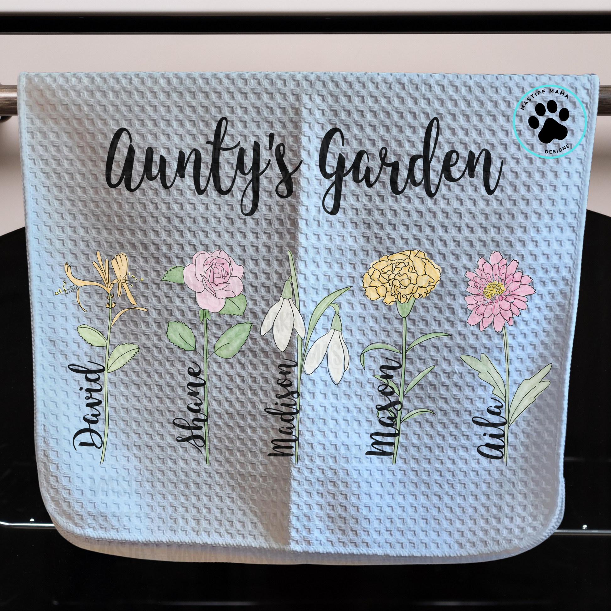 Aunty's Garden Custom Birth Month Flowers and Names on Waffle Kitchen Towel -Design will only be printed on one side of the towel.